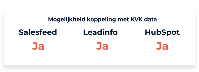 Bij het koppelen van het juiste KVK-nummer telt SalesFeed de meest accurate koppeling: maar liefst 98% juiste KVK nummers. Een opmerking bij dit getal is dat SalesFeed alleen Nederlandse bedrijven trackt, wat de kans op de juiste koppeling verhoogt. Voor Leadinfo ligt dit percentage iets lager.